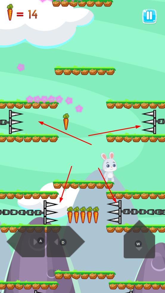 2、收集胡萝卜闯无尽关:在跳跃过程中主动收集沿途的胡萝卜,借助敏捷的反应力应对随机出现的陷阱与变化的地形,由于关卡无尽且地形随机,向上的道路会不断延伸。