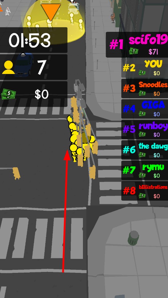 1、实时群体操控:单指滑动即可指挥数十人队伍变向、加速,吸附行人时呈现“磁吸式”聚集动画,围堵对手时成员自动形成包围圈,操作丝滑又具策略深度。