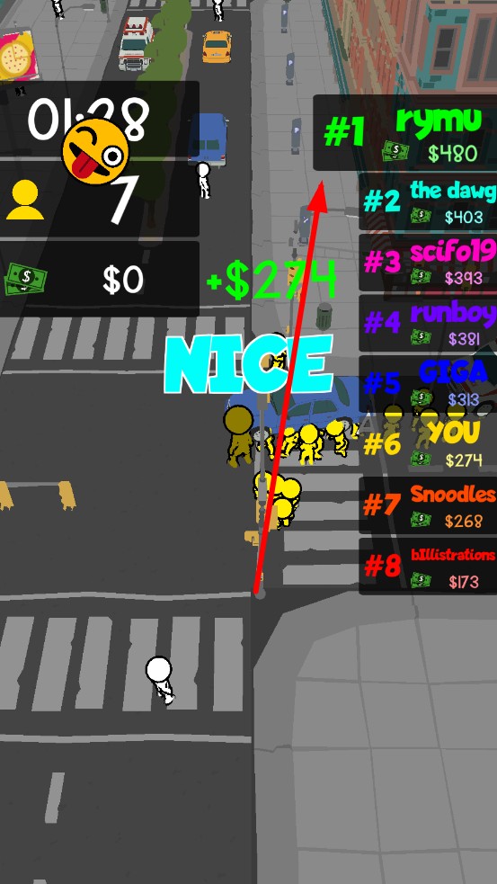 城市地震是一款多人实时竞技游戏,玩家操控小人在车水马龙的都市街道吸附行人壮大队伍,实时匹配全球玩家同场竞技,借抢占资源点、灵活规避警车撞击等策略积累财富,在每局三分钟的紧凑限时赛中角逐排名,融合群体操控与策略对抗玩法,搭配卡通低模画风,打造快节奏都市掠夺对决。