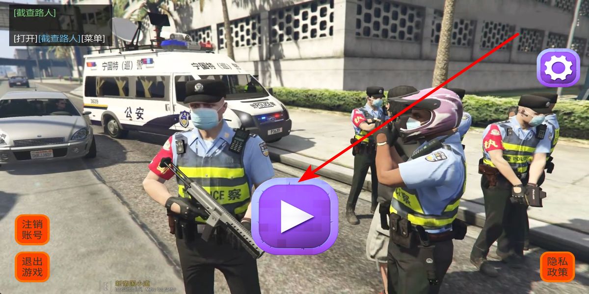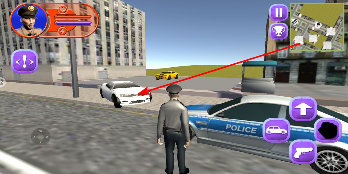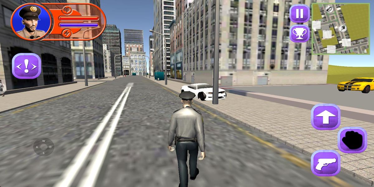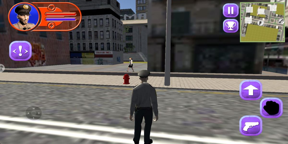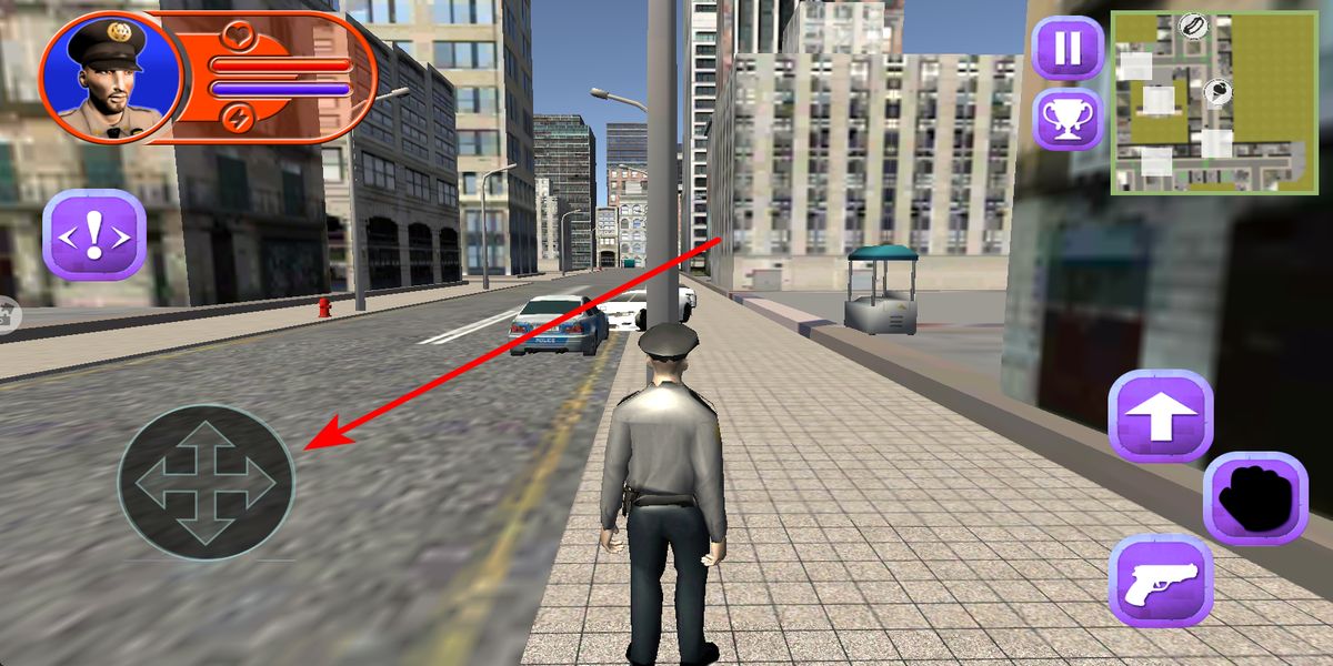 1、进入游戏,点击紫色播放键开启流程,通过方向控制键操控警察移动,熟悉角色行动方式,在街道场景中自由穿梭,为后续任务执行做准备。