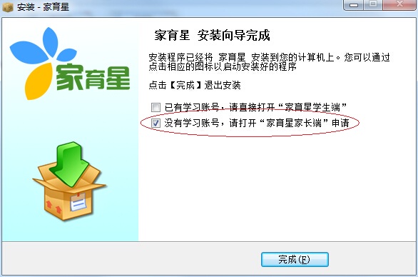 2.一直到安装完成界面,注意勾选“没有学习账号,请打开“教育星家长端申请”