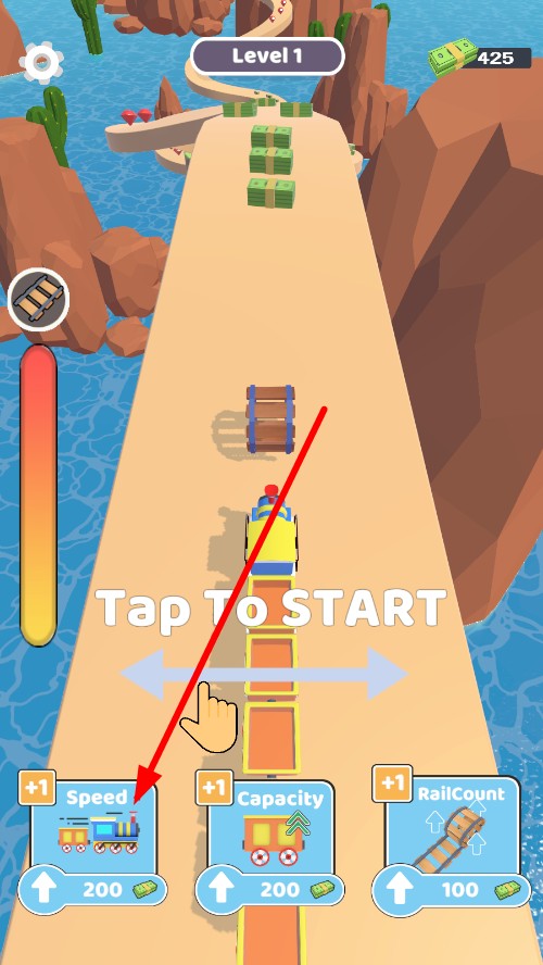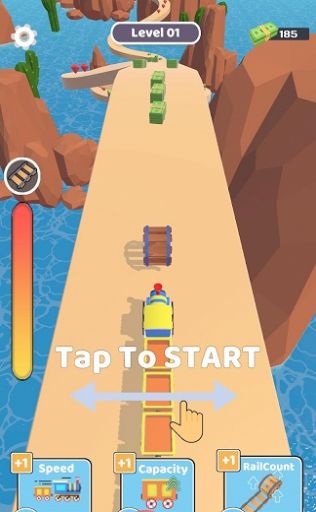 1、开局进入沙漠赛道,底部显示速度、容量、轨道数升级项,消耗金币提升属性后,点击Tap To Start启动火车。