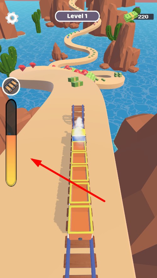 2、滑动屏幕控制火车左右移动,收集路径上的金币堆、宝石箱,遇到断路时,自动铺路,左侧黄色进度条代表油量。