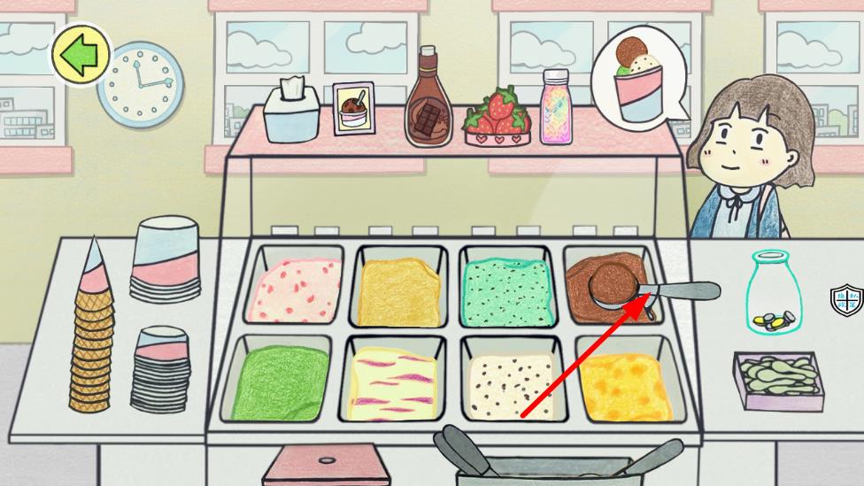 2、当顾客来到店前并点单时,根据需求在操作台上选择对应原料,如奶油、水果、巧克力等,按步骤完成雪糕制作,递交给顾客获取金币。