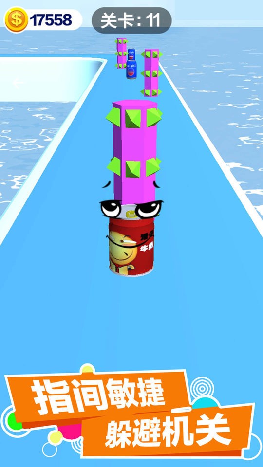 2、在跑酷过程中,通过左右滑动屏幕控制饮料瓶转向,向上滑动使其跳跃过障碍物,向下滑动让其贴地滚动穿过低矮通道,持续前进并收集沿途的金币。