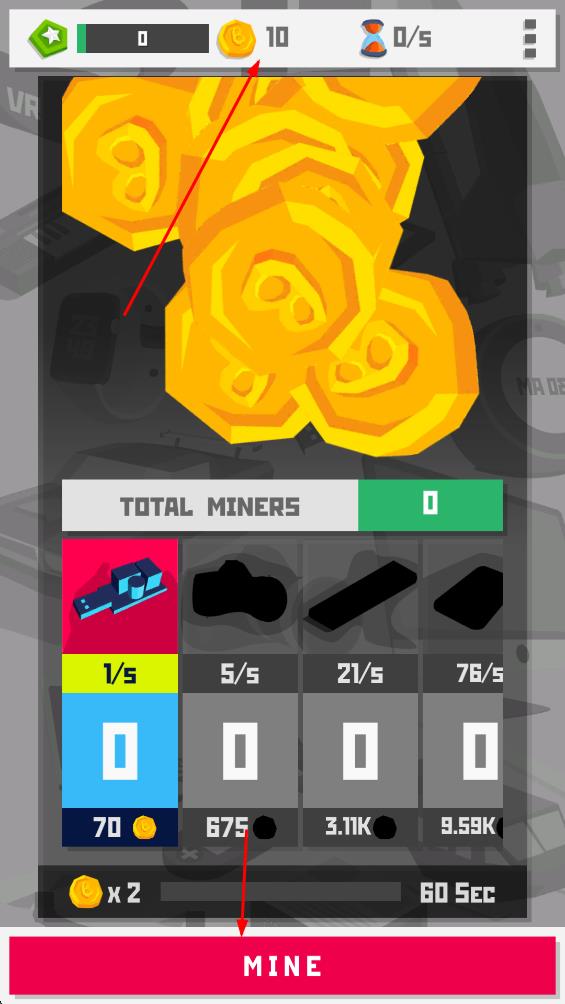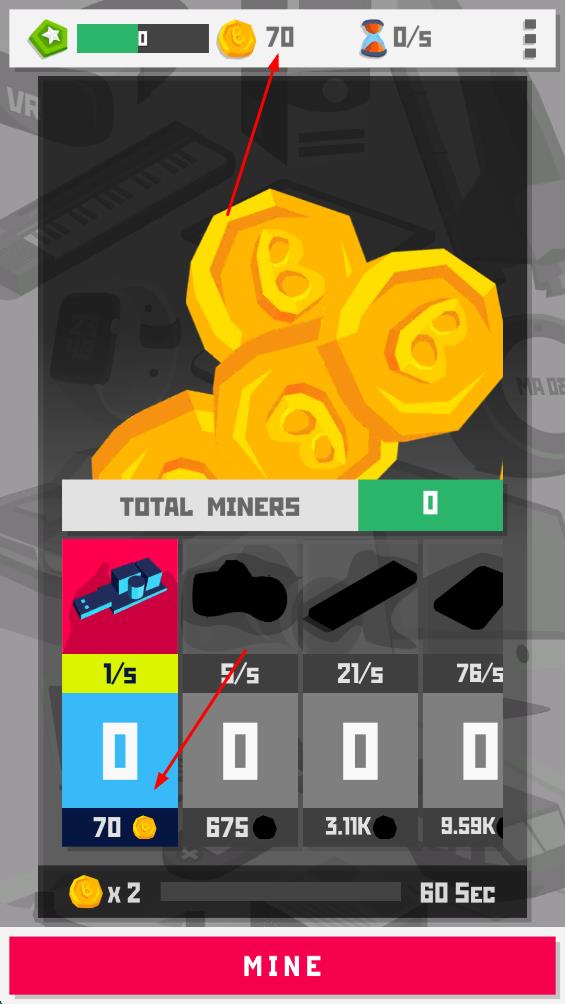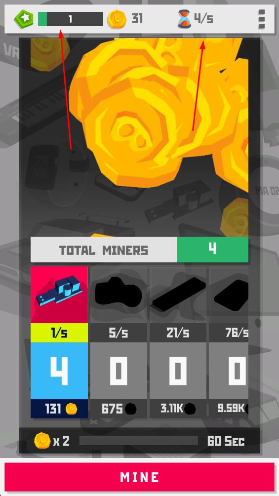 2、消耗金币解锁或升级矿工,提升每秒金币收益。