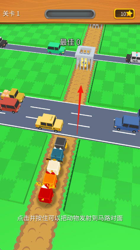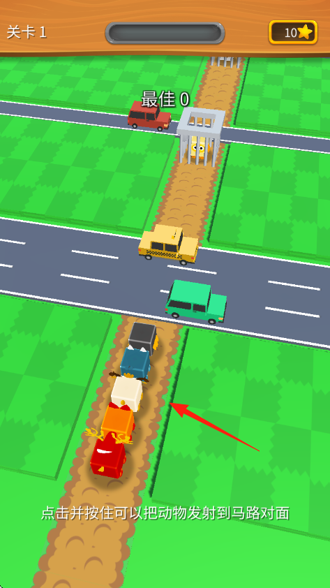 1、关卡1,点击按住彩色动物红箭头,蓄力准备发射,注意躲避马路上的车辆。