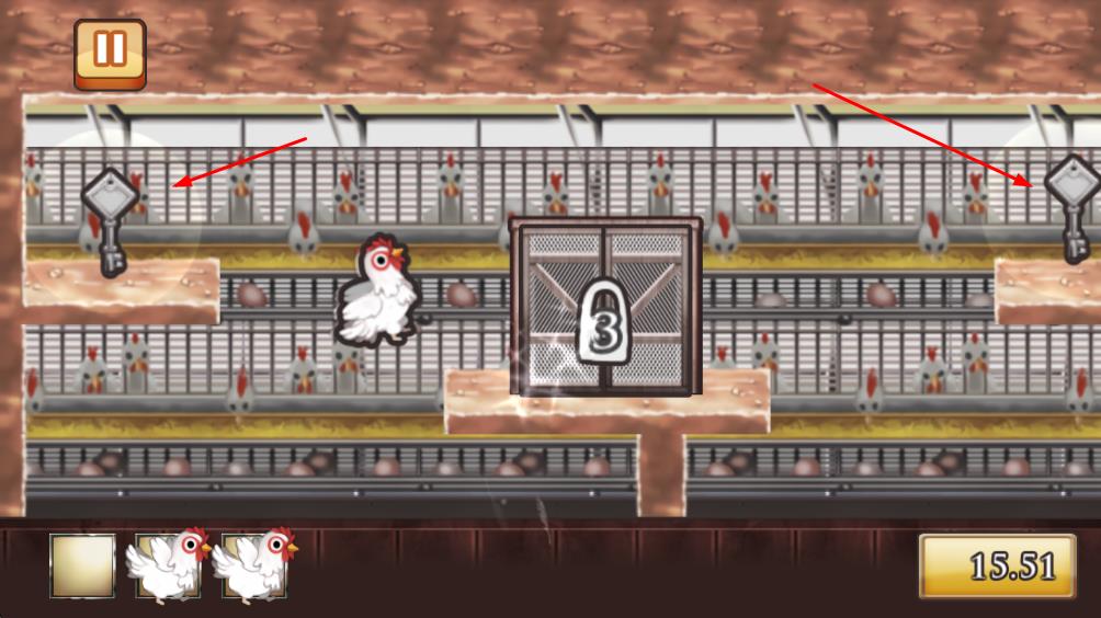 2、引导小鸡移动,收集场景两侧的钥匙道具。