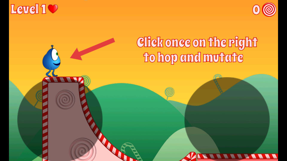 1、第一个阶段,点击右侧的区域,让蓝色的小怪物跳跃并突变,按照提示操作来完成基础的动作。