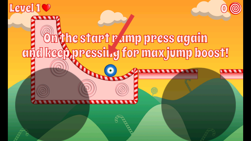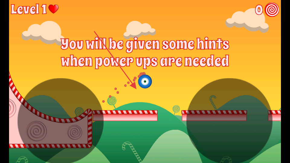 3、遇缺口等需强化跳跃场景,留意提示hints when power ups are needed,重复长按操作,完成关卡。