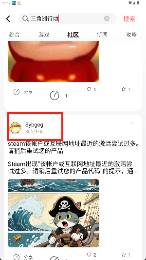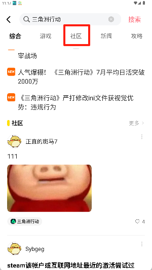 3、搜索到游戏后,点击社区,即可进入社区与用户互动。