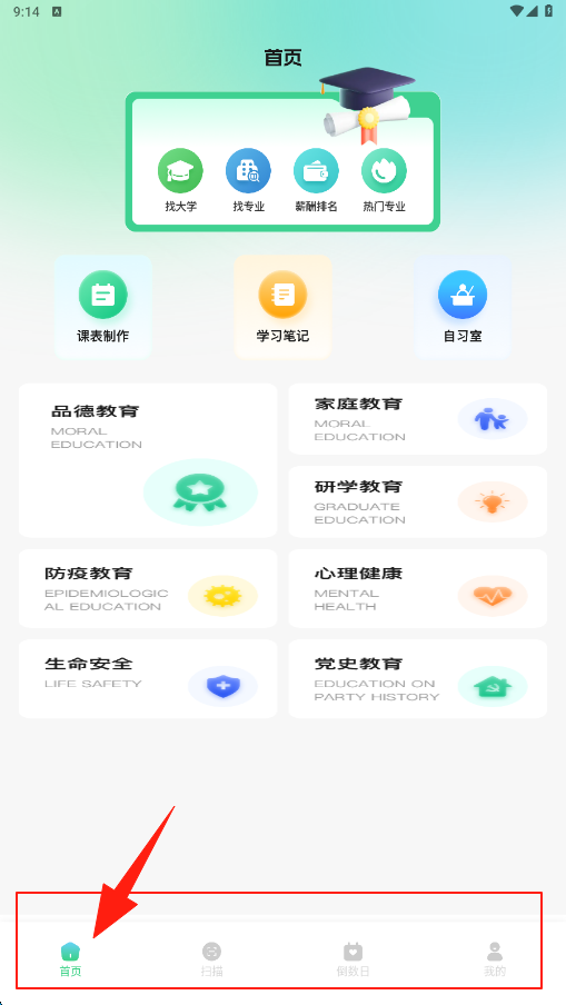 1、在首页可使用找大学找专业等教育功能,也能进入课表制作学习笔记等模块开展学习。