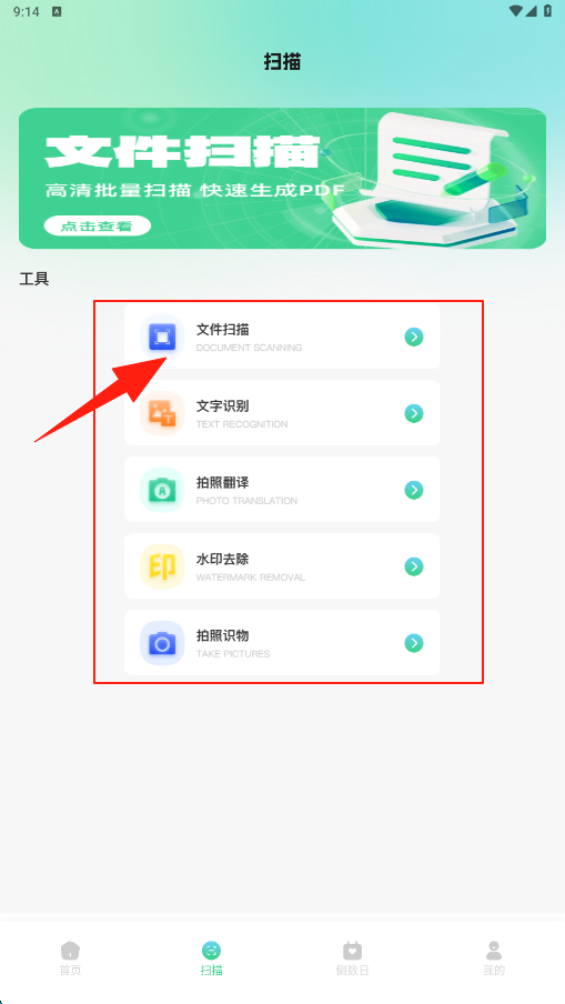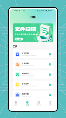 2、切换到扫描页,点击文件扫描工具,可高清批量扫描生成PDF,还能使用文字识别等功能。