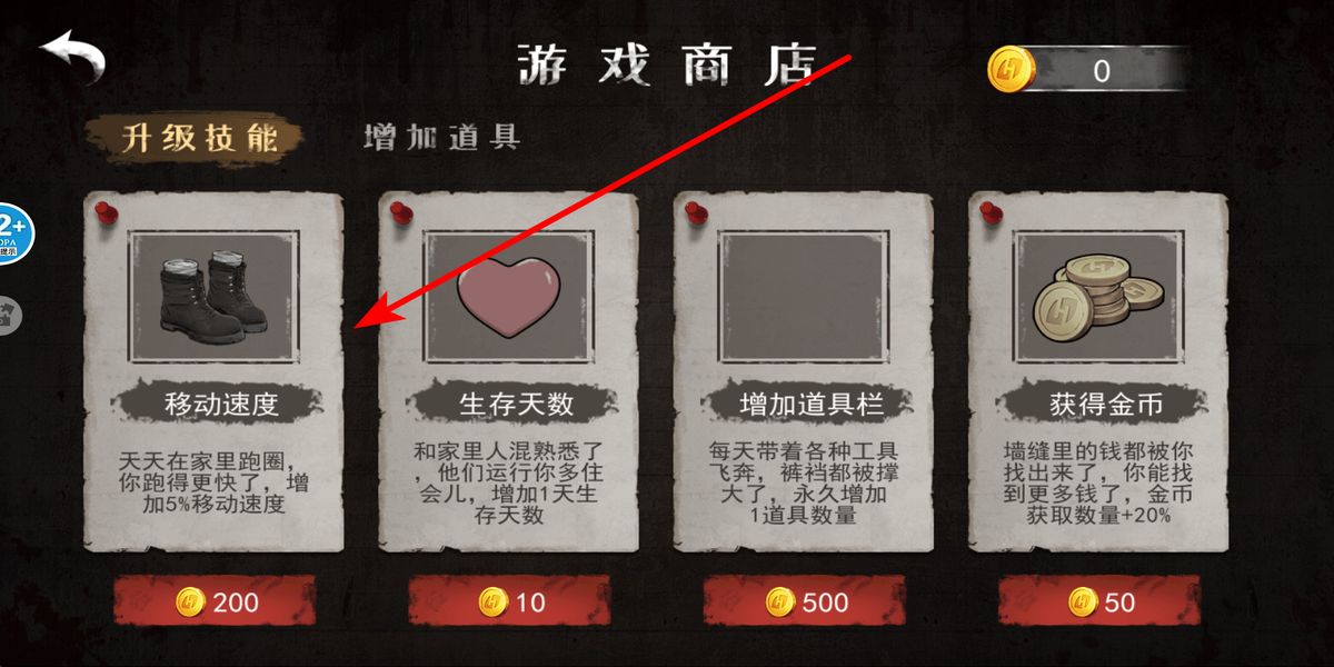 2、点击商店,优先用金币升级移动速度,提升移速方便灵活躲避老奶,后续按需选生存天数等技能升级,逐步强化生存的能力。