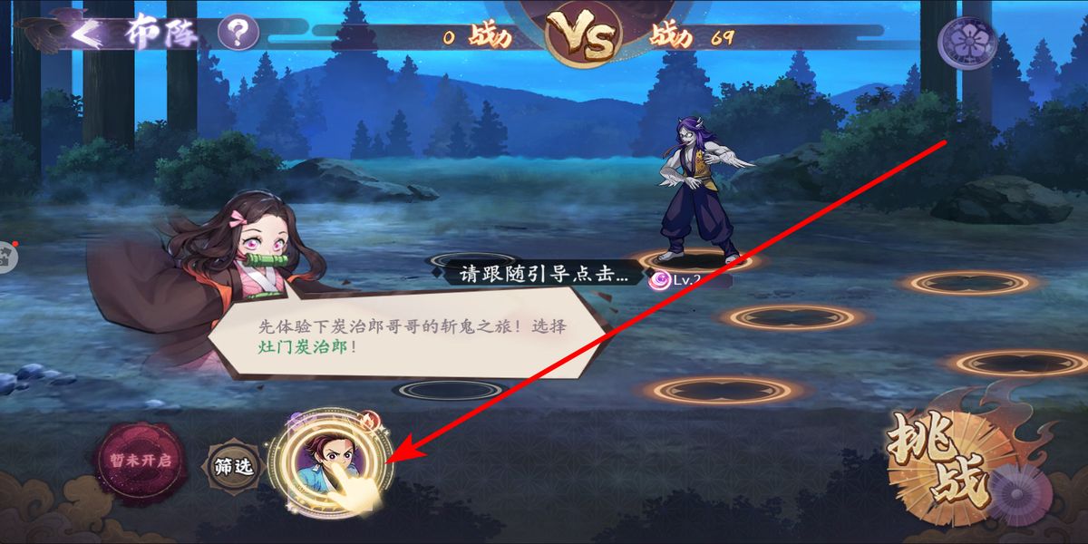 2、进入战斗布阵阶段,界面会有引导提示,跟随指引点击,按提示选择灶门炭治郎等角色,为战斗配置出战角色,做好战斗准备。
