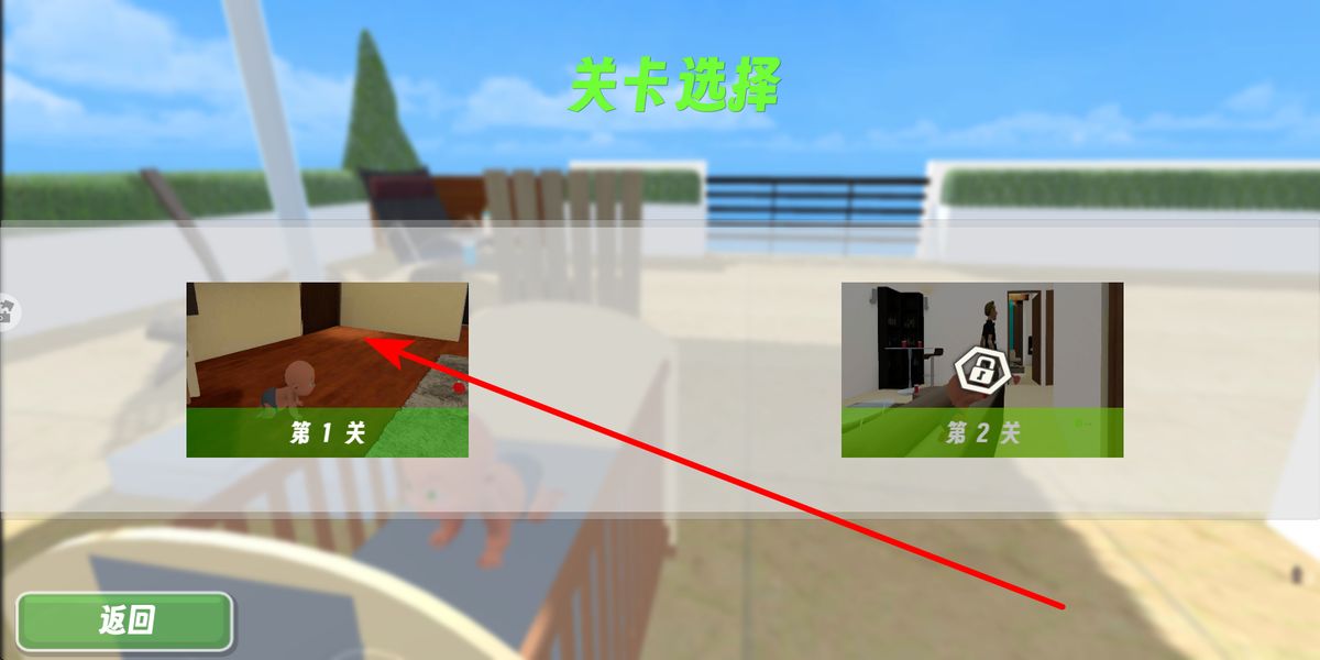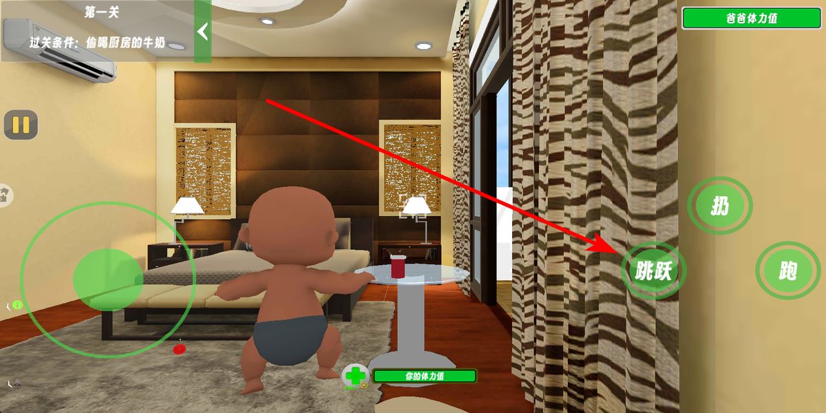 1、进入第一关,明确过关条件为偷喝厨房牛奶,操控左下角虚拟摇杆,控制宝宝在卧室移动,熟悉跑跳跃扔按钮功能,为行动做准备。