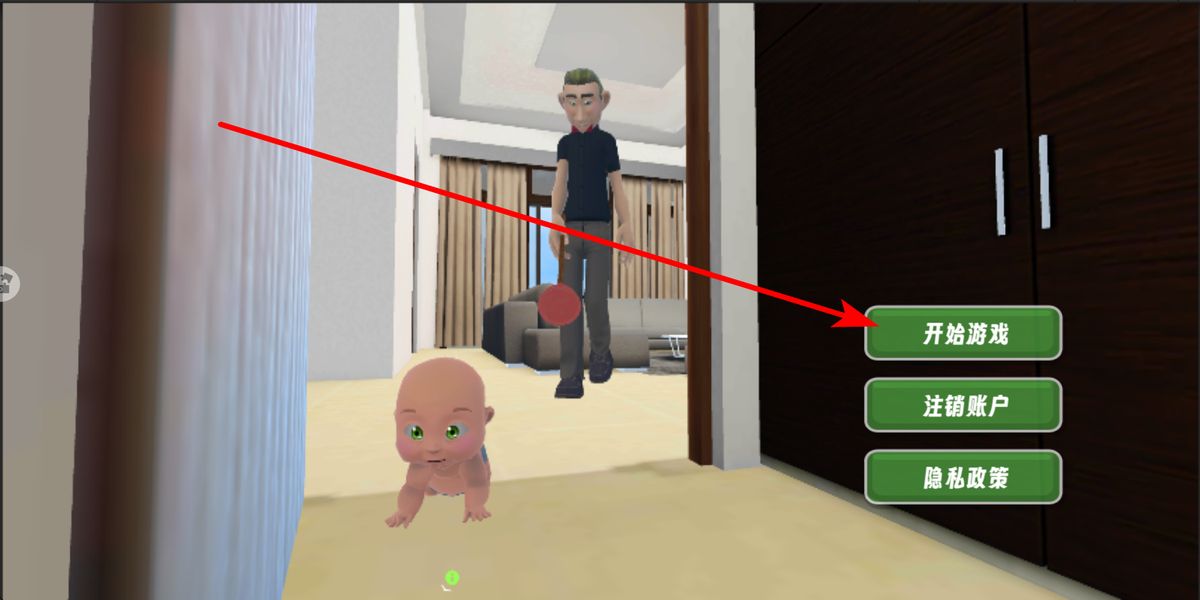 2、从卧室出发,沿场景通道爬行,路过卫生间等区域时,留意爸爸体力值,若爸爸靠近,利用跳跃跨越障碍,借家具遮挡躲避,保持安全移动。