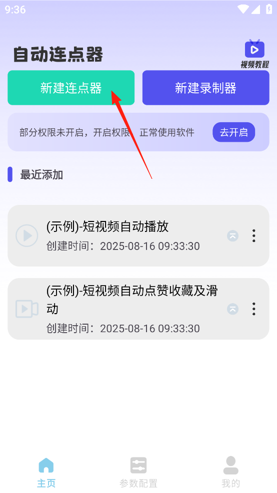 1、在一键自动点击器主界面,设有新建连点器和新建录制器两个主要功能按钮,界面还展示了最近添加的示例任务,方便用户快速查看和使用已有的自动操作配置。