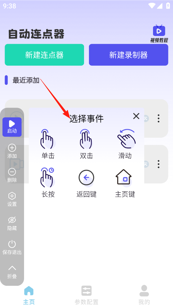 3、当在自动连点器中选择添加操作时,会弹出选择事件窗口,这里提供了单击双击滑动等多种操作事件选项,用户可从中挑选合适的事件,来精准定义自动连点器的操作行为。