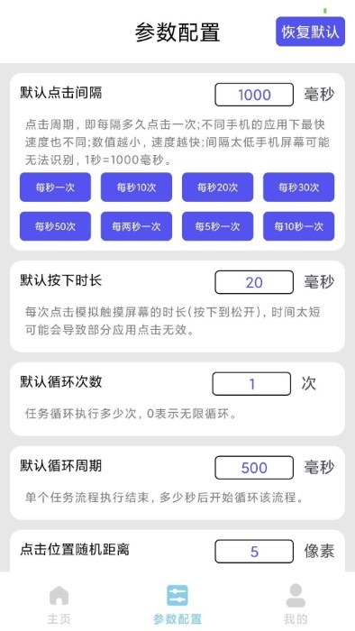 3、参数调节精准可控:对触摸时长、点击频率、执行次数等参数的设置细致且精准,模拟不同的效果,从短时间点击到长时间长按,从低速点击到高速点击,都能精准实现。
