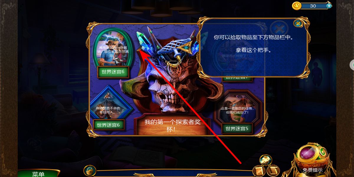 2、在场景中根据提示拾取物品到下方栏,像把手等道具,留意物品描述与场景关联,思考用途比如把手可能对应特定机关,为解谜备关键道具。