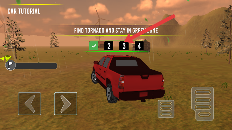 1、用左右箭头控制方向,踏板控制车速,沿黄色指引找龙卷风,靠近时留意绿色区域提示。