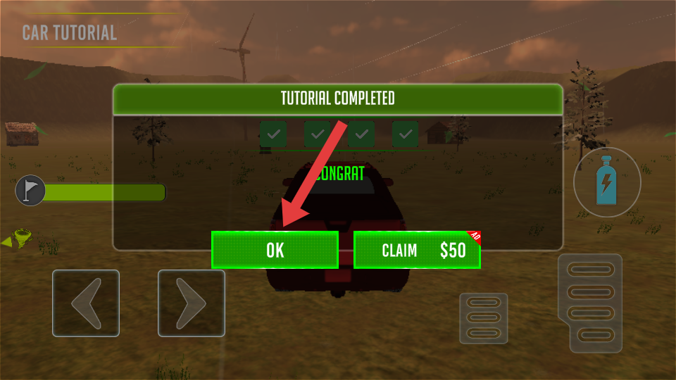 3、教程完成后,点击CLAIM50领取奖励,熟悉车辆操控,为后续找龙卷风、完成挑战做好准备。