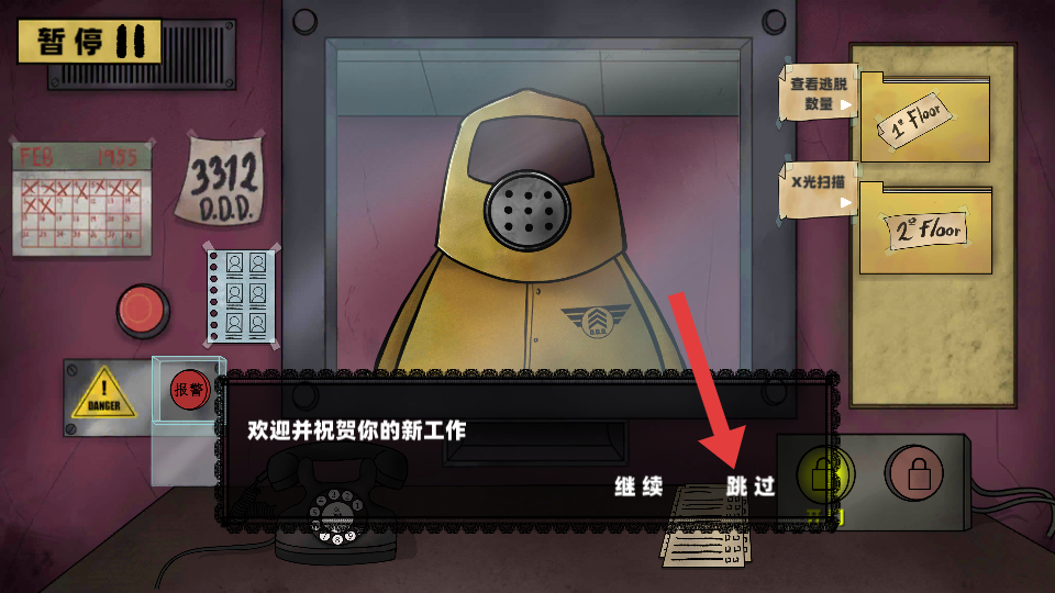 1、点击继续看新工作剧情,遇穿防护服角色对话后,按指引操作如点击报警按钮,触发人物识别流程。