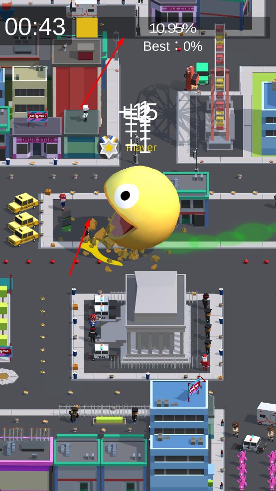 3、角色变大后,撞击城市建筑等物体,提升上方进度百分比,冲击更高纪录。