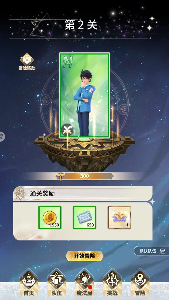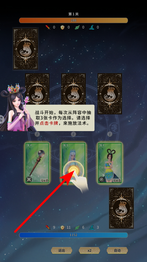 2、主界面的下方有冒险等功能,点冒险进入挑战关卡,战斗前抽取卡牌,依据提示选卡施法,利用卡牌技能应对敌人,推进关卡。