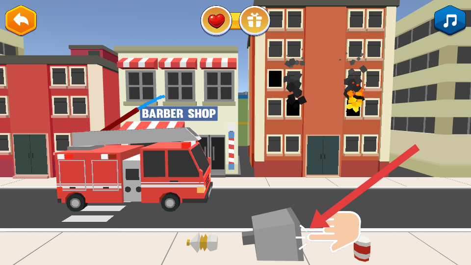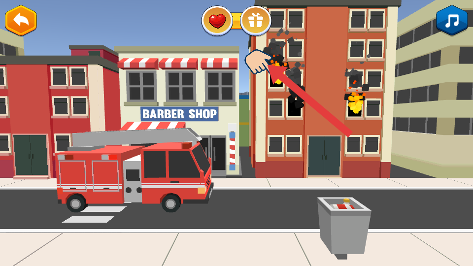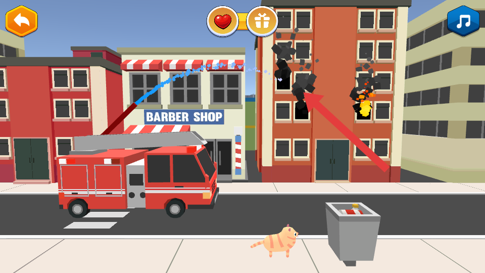 3、关注爱心生命和时间,高效灭火、互动,借助BARBER SHOP周边场景掩护,扑灭所有火焰。