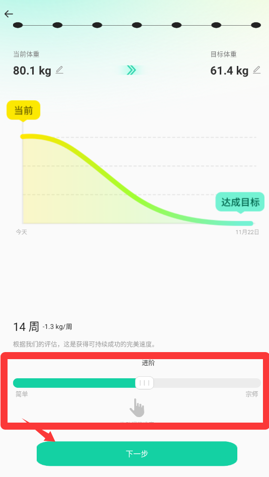 4、红色框框哪里是可以调节多少周可以达成目标体重。