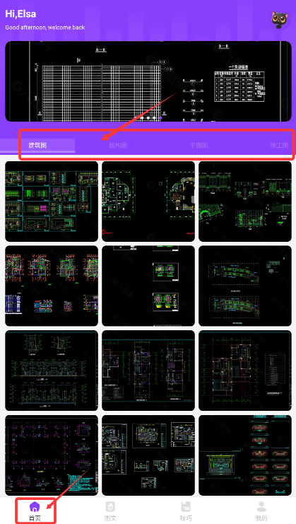1、启动应用后,主界面展示建筑平面图、结构详图等专业图纸资源。
