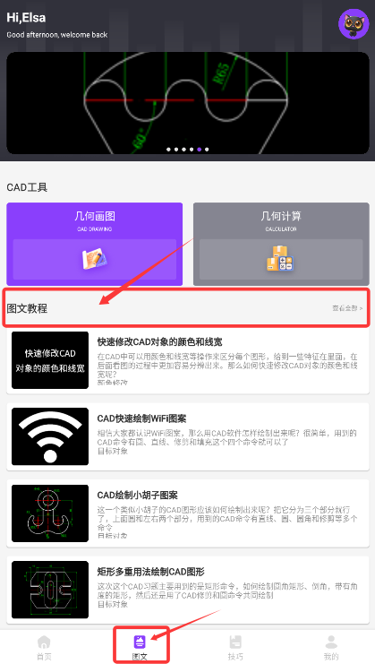 2、切换至图文页面,提供快速修改、快速绘制等实用设计教程。