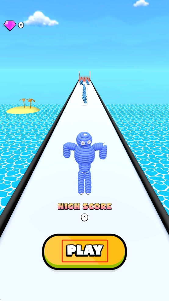 1、进入作品后,点击下方的PLAY按钮,操控蓝色人形角色在水上跑道开始奔跑,收集道具壮大自身。