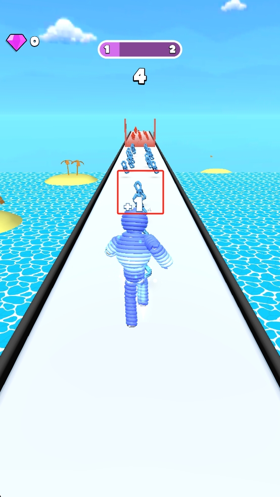 2、角色奔跑时,注意拾取跑道上的蓝色链条状道具,增加自身组件数量,同时避开红色障碍区域。