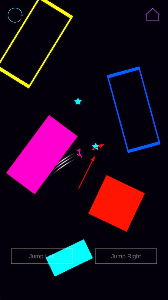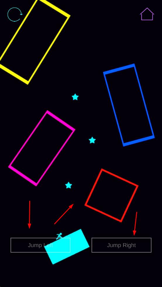 1、点击界面Jump Left或Jump Right按钮,操控小人左右跳跃,瞄准荧光星星移动,规划跳跃路径。