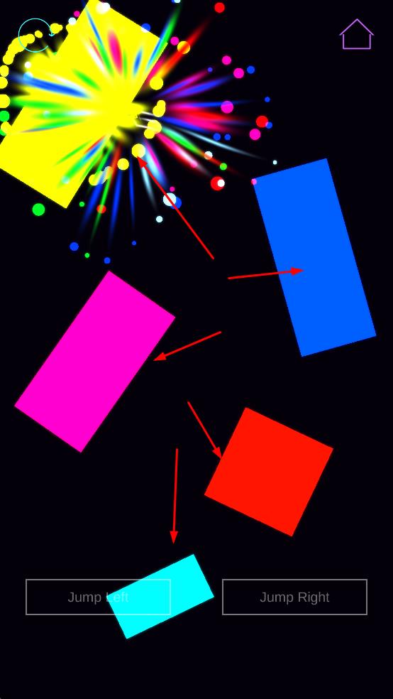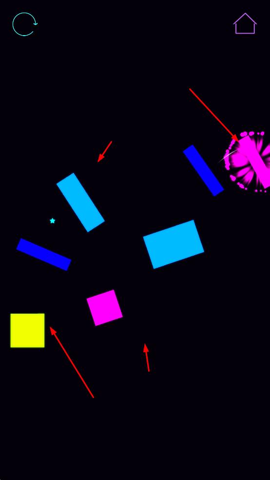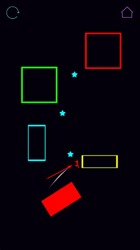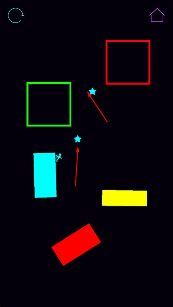 1、控制跳跃接触方块:进入关卡后,通过点击虚拟按钮控制火柴人跳跃方向与时机,在不同颜色的方块间移动,待所有方块接触完毕后即可完成当前关卡挑战。