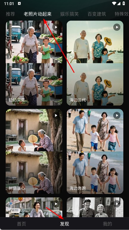 2、也可以点击底部发现,在分类,如老照片动起来,娱乐搞笑中挑选喜欢的风格案例,获取创作灵感。