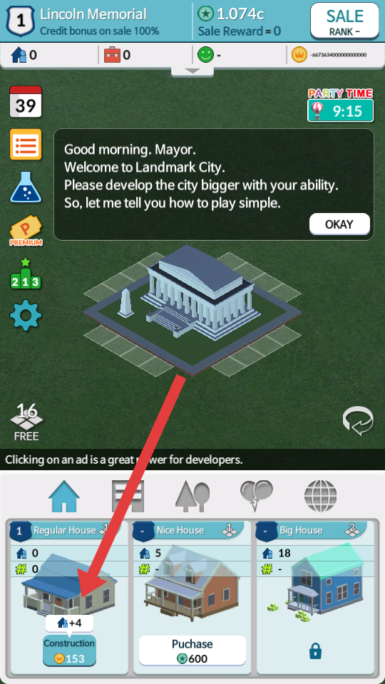 1、点OKA按键进行下一步引导,优先建Regular House花费153金币,放到林肯纪念堂旁,积攒居民数。