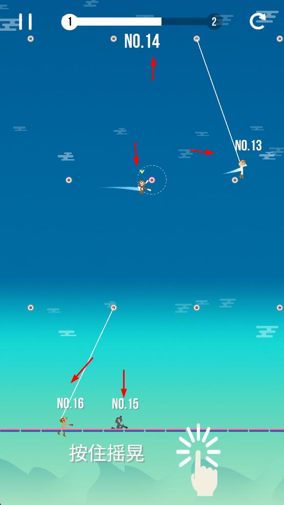 1、操控绳子空中飞行:进入游戏后,玩家通过基础操作控制角色抛出绳子,接住支撑点后实现空中飞行,过程中需根据场景变化调整绳子抛出时机与角度。