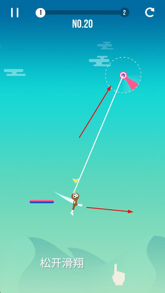 1、简约画面虐心玩法:采用清新简约的画面风格,视觉上干净舒适,无多余元素干扰;虽操作简单,但玩法极具“虐心”特质,玩家在操控绳子飞行时易因衔接失误或方向偏差失败。