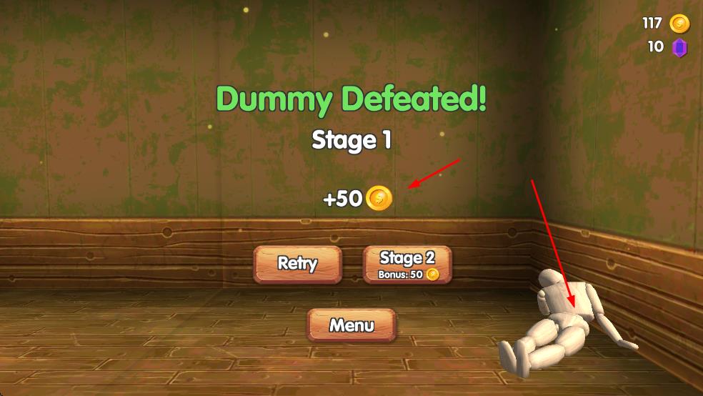 2、成功击败Dummy后,可获取金币奖励,点击Stage2开启下一阶段挑战。
