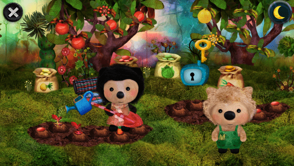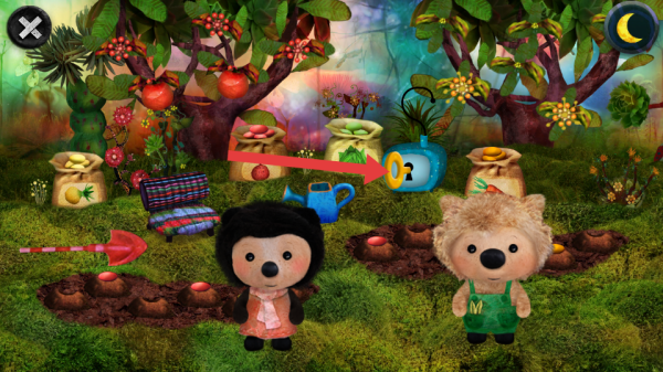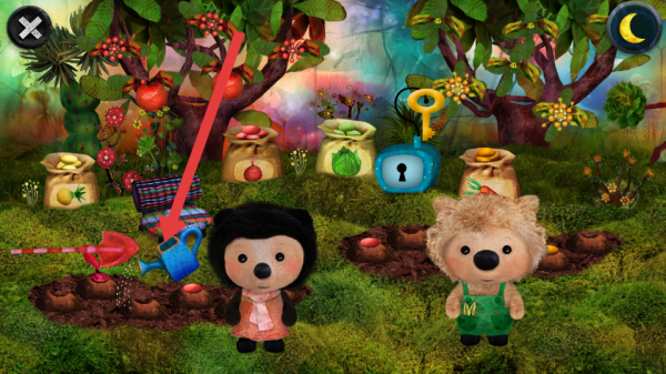 1、物品互动与场景探索:核心玩法围绕物品互动展开,孩子可拖动铁锹到毛绒人物手中,控制人物在土堆里松土,将水壶交给人物,在土堆里放入种子后浇水。