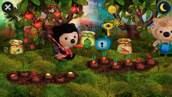 2、高自由度互动操作:支持拖动、组合游戏内各类物品与角色,可将工具(铁锹、水壶)交给毛绒人物,也能移动种子、瓜果、钥匙等道具触发了对应的互动。