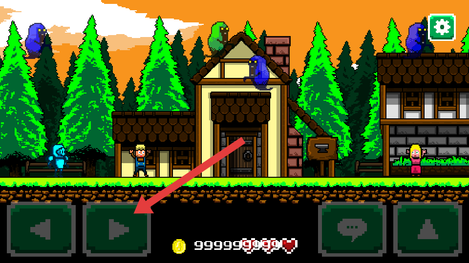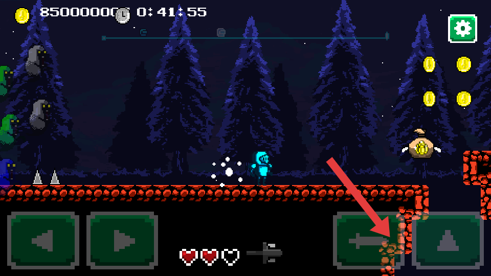 3、进入森林关卡,注意避开尖刺陷阱,收集空中金币和钱袋,利用移动按键操控角色跳跃、前进,完成关卡挑战。