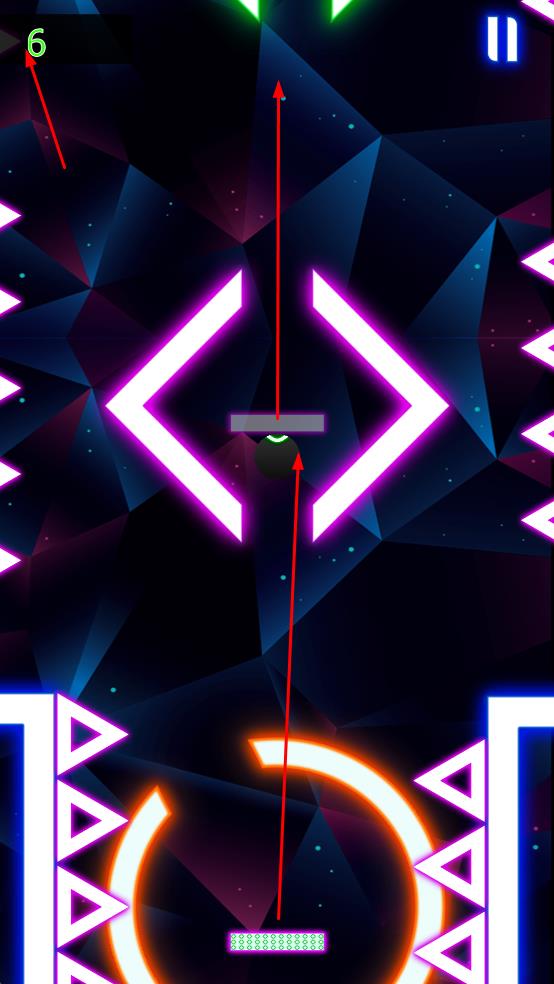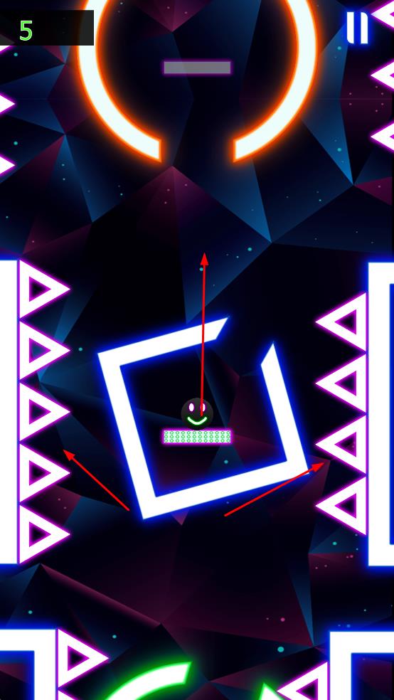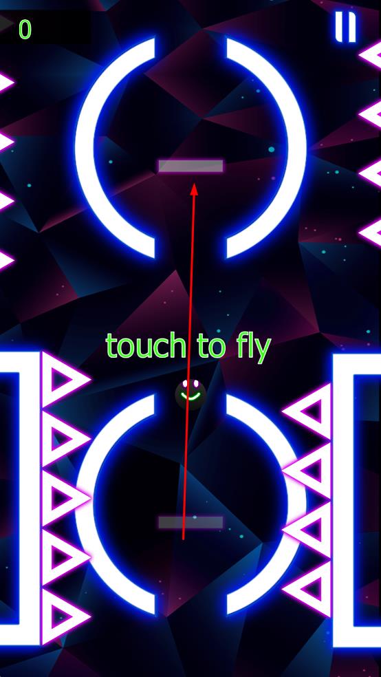 1、点击屏幕触发touch to fly指令,操控小球向上飞行,躲避霓虹圆环、三角等障碍,开启闯关进程。