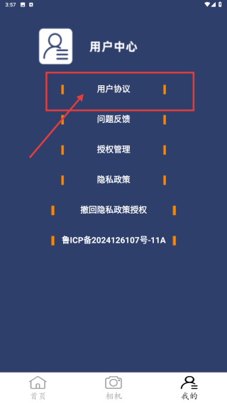 3、进入用户中心界面,点击用户协议选项,查看平台使用规则与用户权益相关内容,点击查看。
