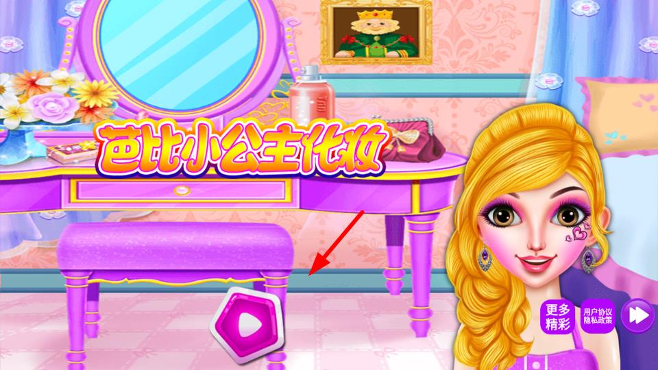 3、可爱的卡通风格:芭比公主采用萌系卡通形象设计,色彩鲜艳、造型可爱,护理和化妆道具也充满童趣,营造出适合宝宝的轻松游戏氛围。
