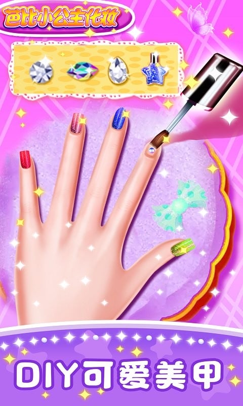 2、完成基础护理后,进入美妆环节,选择眼影、口红、腮红等彩妆用品,为公主打造精致妆容,还能设计独特的美甲样式,搭配不同的指甲油颜色和图案。